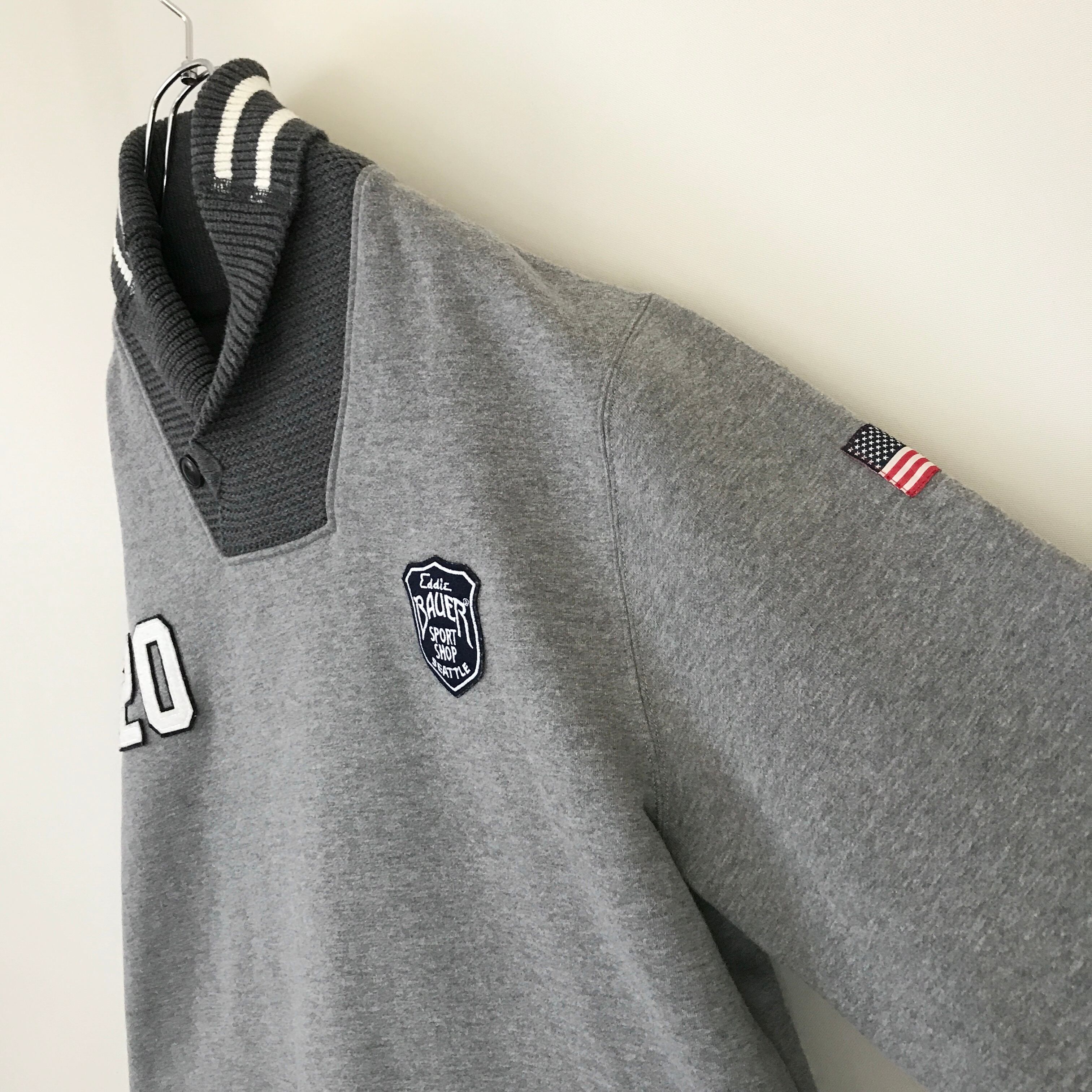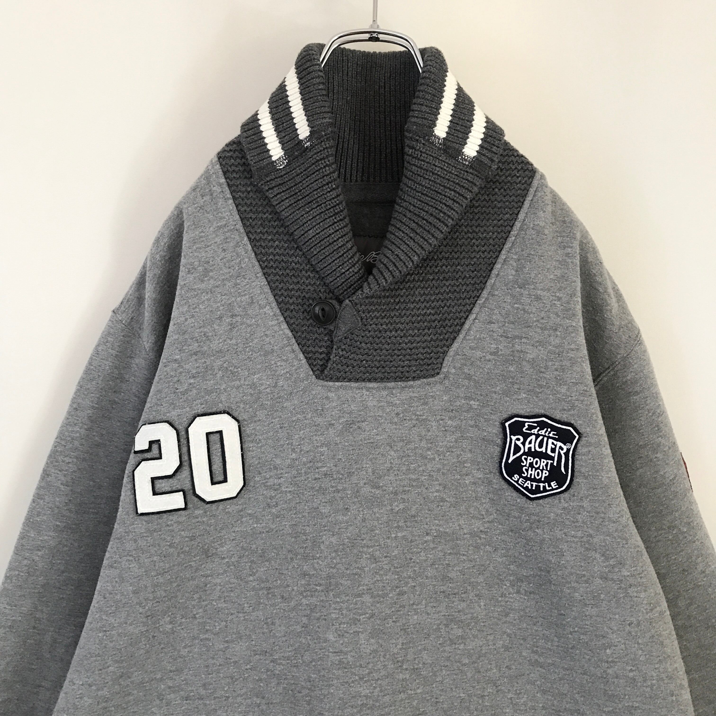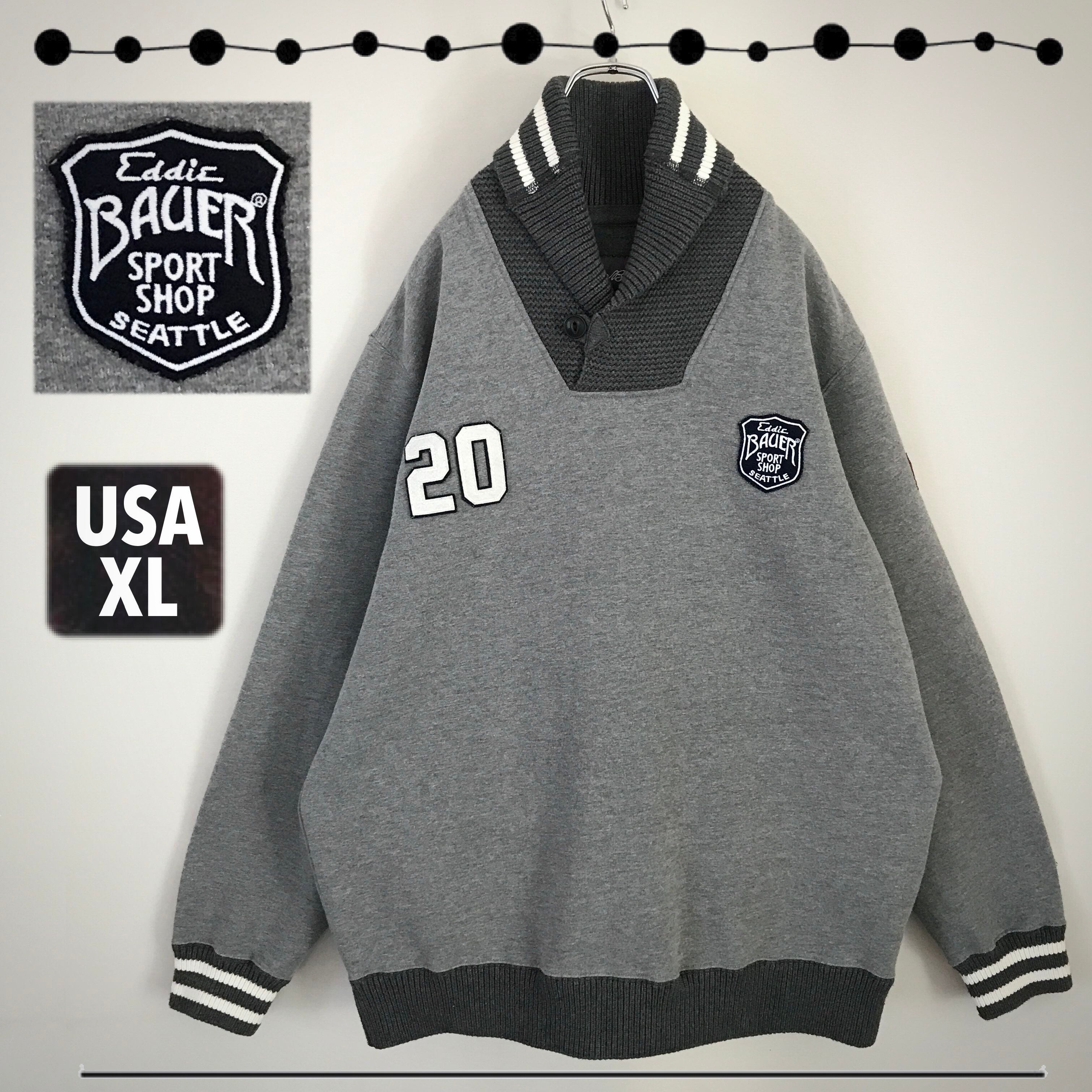EDDIE BAUER エディーバウアー★裏地フリース/スウェット★スポーツショップワッペン★ショールカラーリブ★ライン入ゴツリブ★USAメンズXL