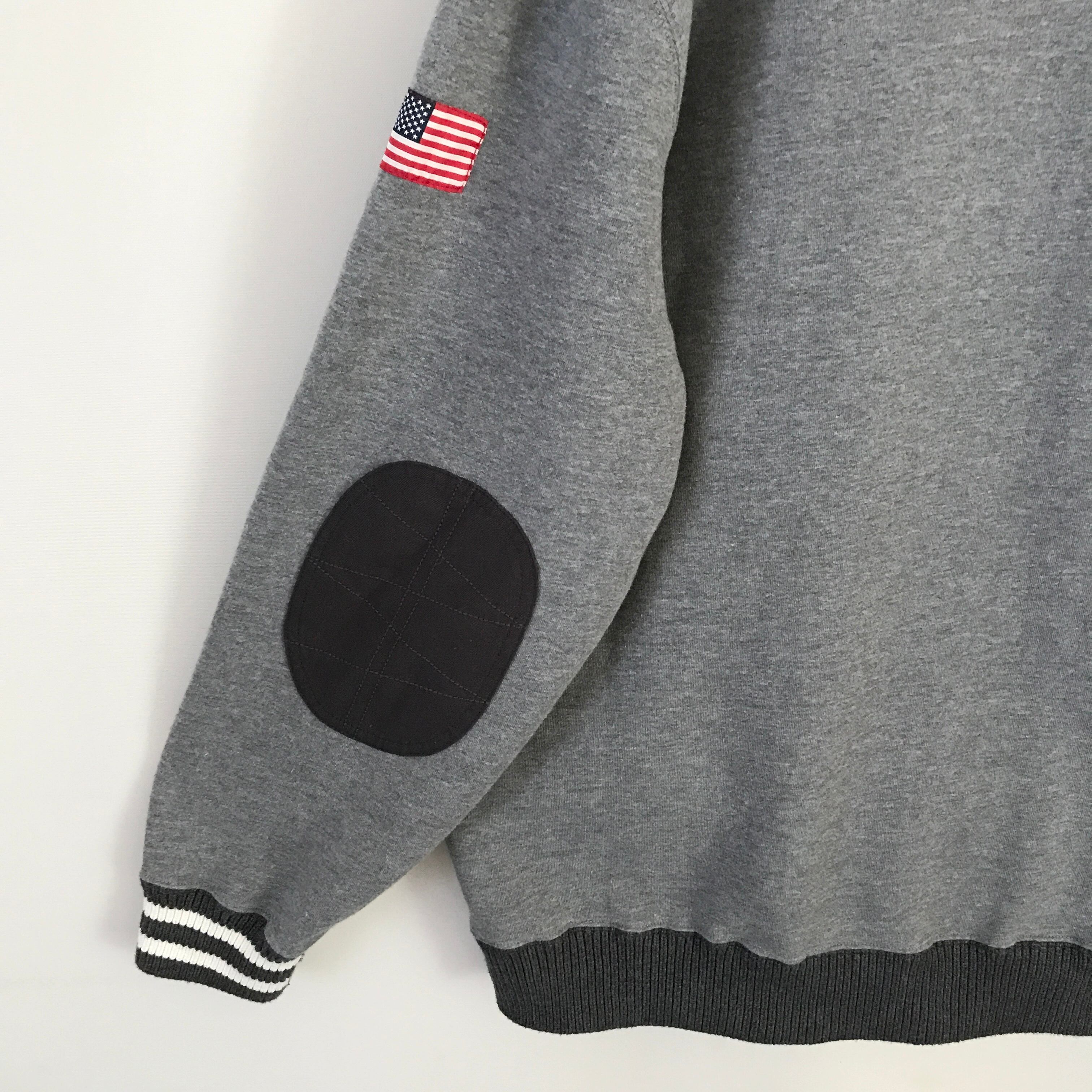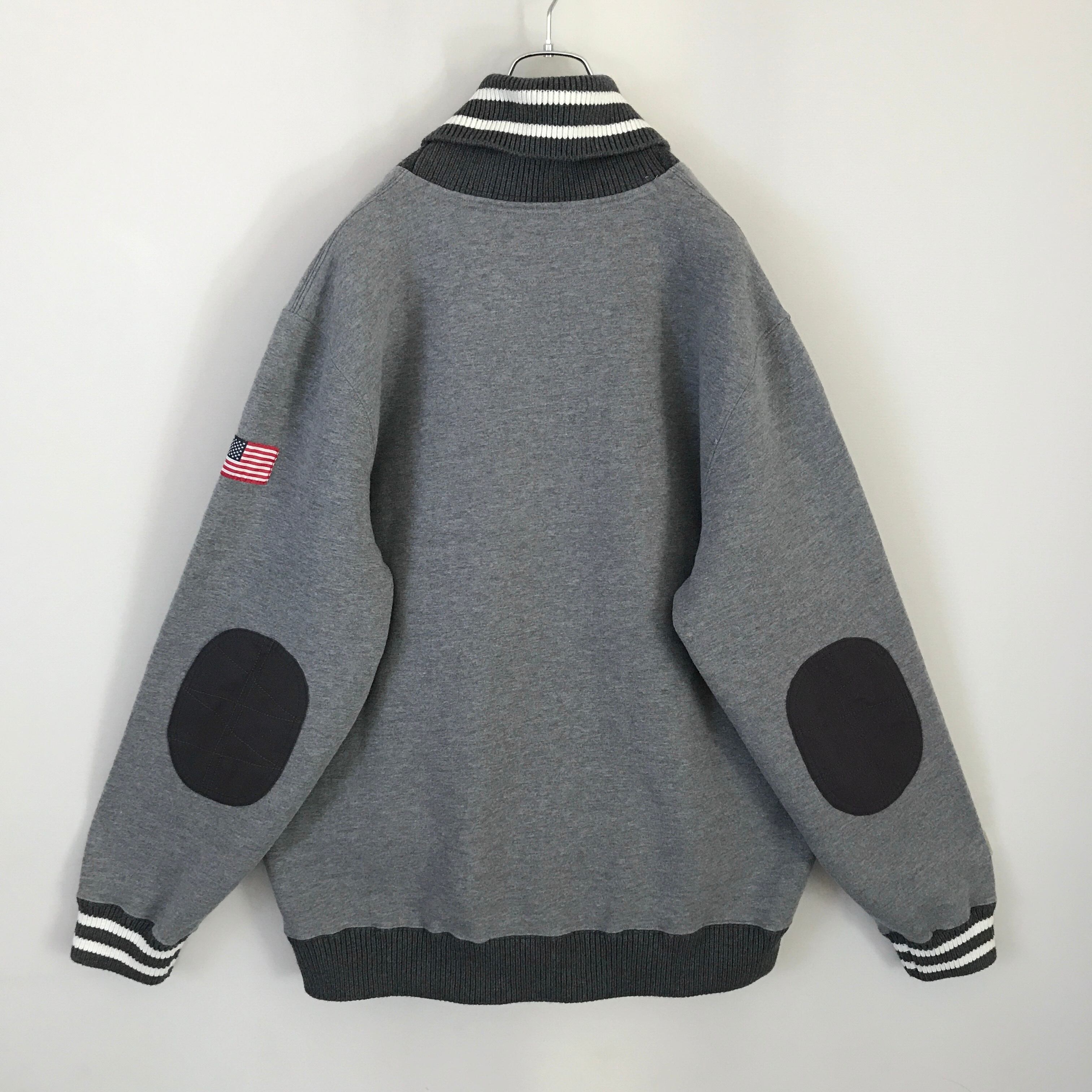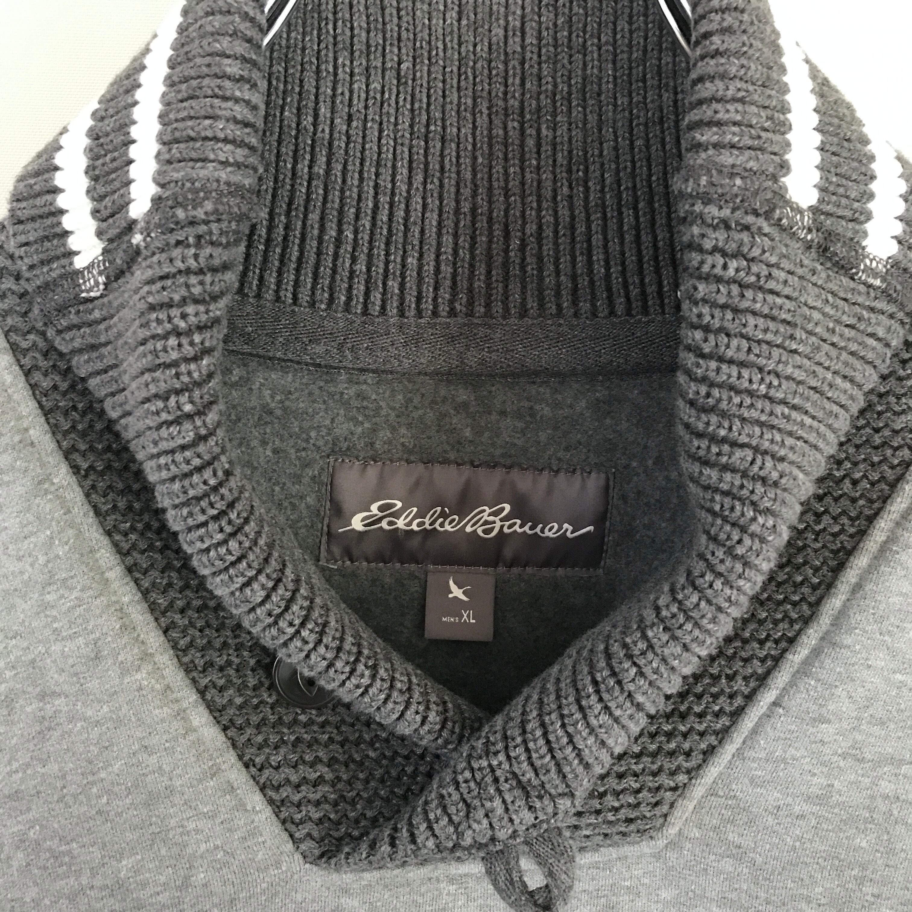EDDIE BAUER エディーバウアー★裏地フリース/スウェット★スポーツショップワッペン★ショールカラーリブ★ライン入ゴツリブ★USAメンズXL